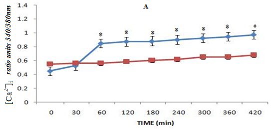Figure 3 shows the time-course changes [Ca2+]i in ex- pressed as fluorescence ratio units (A) U87- MG cancer cell lines following incubation with 800 µM of α, β momorcharin (solid diamonds). The changes in [Ca2+]i in untreated (control) U87- MG cancer cell lines are also shown in the figure for comparison (solid squares). in a 5% CO2 incubation.
