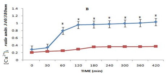 Figure 1 and 2 shows the time-course changes in [Ca2+]i expressed as fluorescence ratio units, in (A) 1321N1 and (B) Gos-3 cancer cell lines (solid diamonds) follow- ing incubation with 800 µM of α, β momorcharin for 420 min. The changes in [Ca2+]i in untreated (control) 1321N1 and Gos-3 cancer cell lines (solid squares) are also shown in the figure for comparison. The results show that incubation of the two cancer cell lines with α, β momorcharin can result in significant (p < 0.05) time- dependent increases in [Ca2+]i in both cancer cell lines compared to control (untreated) cells. Maximal increas- es in [Ca2+]i was attained after 420 min of incubation. In control (untreated cell lines), [Ca2+]i remained more or less stable in both cell lines after 420 min. The re- sults also show that the increase in [Ca2+]i in Gos-3 cell line was much more pronounced following incubation with α, β momorcharin compared to 1321N1 cell line.
