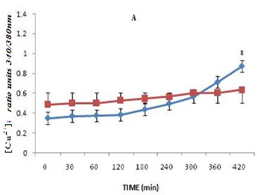 In contrast, with untreated U87–MG cell line basal [Ca2+]i remained more or less the same over 420 min. However, in U87-MG cell line treated with α, β momor- charin [Ca2+]i decreased slightly for 0 - 420 min com- pared to untreated control but then increase gradually for 360 min to 420 min when it was significant (p < 0.05) compared to control untreated cells.