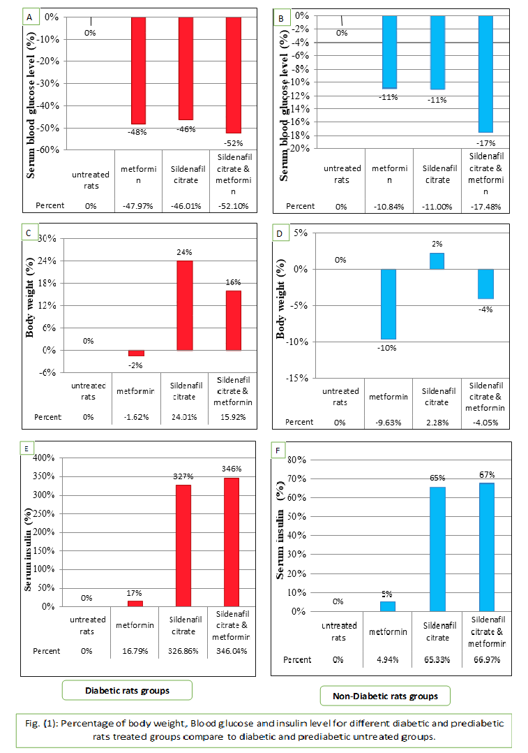 The results present study showed that administration of sildenafil citrate to prediabetic and diabetic albino rats treated with metformin has no significant changes on BW. The BW of diabetic rats treated with metformin by decreased by 2% and in diabetic rats treated with Sildenafil citrate and (Sildenafil citrate & metformin) by 16% and 3% respectively in comparison with diabetic untreated rats as shown in fig (1). Body weight decreased by 10% and 2% in prediabetic rats treated with metformin and (Sildenafil citrate& metformin) but in prediabetic rats treated with Sildenafil citrate body weight increased by 2% respectively in comparison with prediabetic untreated rats as shown in fig (1). In the diabetic and prediabetic rats treated with metformin, the results of our work are in agreement with the results obtained byMogul et al., 2003 and Mamikutty et alwho reported that weight loss in obese women who were treated by metformin for 6 months was 5%. In the diabetic and prediabetic rats treated with Sildenafil citrate, the results of our work agree with the results obtained by Johann et al. & Dilworth et al. & Nisoli et al.who found that there is no effect of Sildenafil citrate on body weight [8, 20, 21].