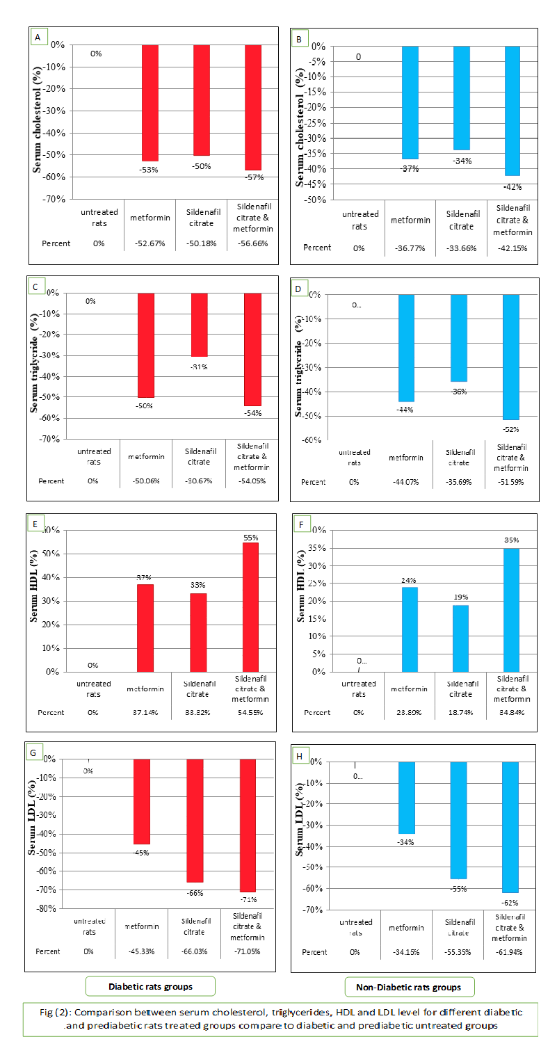 The effect on lipid profile: the results of the present showed that, in diabetic rats treated with metformin, Sildenafil citrate and (Sildenafil citrate& metformin) serum cholesterol level decreased by 53%, 50% and 57% respectively in comparison with diabetic untreated rats, serum triglycerides level decreased by 50%, 31% and 54% respectively in comparison with diabetic untreated rats, serum HDL level increased by 37%, 33% and 55% respectively in comparison with diabetic untreated rats and serum LDL level decreased by 45%, 66% and 71% respectively in comparison with diabetic untreated rats as shown in fig (2). prediabetic rats treated with metformin, Sildenafil citrate and (Sildenafil citrate& metformin) serum cholesterol level decreased by 37%, 34% and 42% respectively in comparison with prediabetic untreated rats, serum triglycerides level decreased by 44%, 36% and 52% respectively in comparison with prediabetic untreated rats, serum HDL level increased by 24%, 19% and 35% respectively in comparison with prediabetic untreated rats and serum LDL level decreased by 34%, 55% and 62% respectively in comparison with diabetic untreated rats as shown in fig (2).