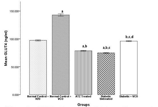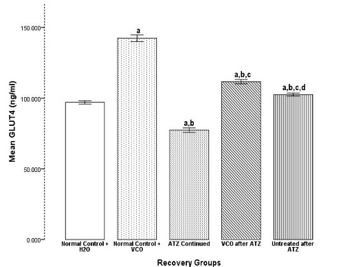 Figure 4 showed that the GLUT4 levels was significantly (p<0.05) lower in ATZ continued group with mean values of 77.39±0.79 when compared with the NC + H2O (97.06±0.57) and NC + VCO (142.46±1.12) groups. The mean values of GLUT4 in the VCO recovered group (111.66±0.76) was significantly (p<0.05) higher than the NC + H2O group and ATZ continued group but significantly (p<0.05) lower than the NC + VCO group. In the untreated group (102.53±0.53), GLUT4 level was significantly (p<0.05) lower than the NC + VCO and VCO recovered group, but significantly (p<0.05) higher than ATZ continued group; though not significantly different from the NC + H2O group.