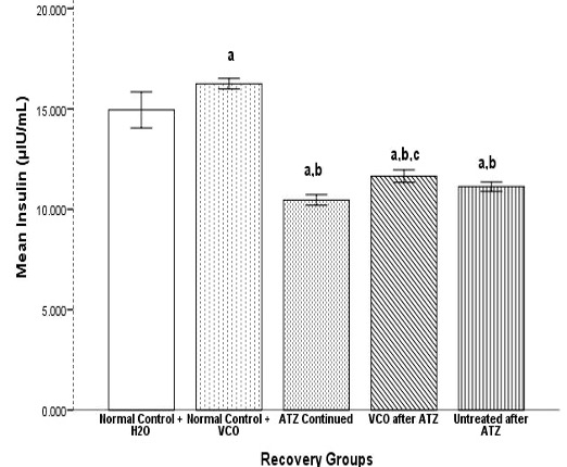 A significant (p<0.05) decrease was observed in mean insulin levels of the ATZ continued group (10.46±0.13) when compared with the NC + H2O (14.94±0.45) and NC + VCO (16.25±0.26) groups. There was a significant (p<0.05) increase with VCO administration in the VCO recovery group (11.65±0.16) when compared to the ATZ continued group, but there was no significant (p<0.05) difference between the insulin level in the VCO recovered and ATZ untreated group (11.13±0.12) (Figure 2).