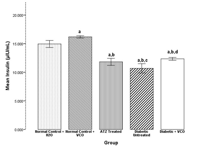 Figure 3. Comparison of Insulin levels in Control, ATZ and Diabetic groups. Values are mean ± SEM. n=7. a = p < 0.05 vs NC, b = p < 0.05 vs NC + VCO, c = p < 0.05 vs ATZ, d = p < 0.05 vs Diabetic control