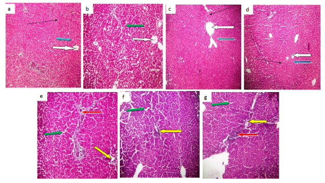 Figure 3. Photomicrograph of liver sections of control rat and Saccharum officinarum molasses treated rats. a- control, b, c and d (1.0.3.2 and 10.0 g/kg SOMMF, respectively), e, f and g (0.6, 2.0 and 6.4 g/kg SOMAqF, respectively). Note the central venules (white arrows), normal sinusoids (blue arrows), hepatocytes (slender arrows). Mild perivascular and periportal infiltration of inflammatory cells (yellow arrows). Mildly dilated sinusoids with infiltration of inflammatory cells (green arrows). Lymphocyte aggregation (red arrows). Stained by H&E, ×100 magnification.