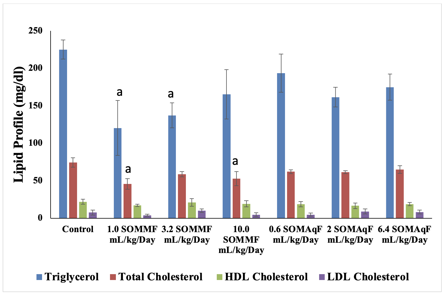 The result (Figure 1) shows there was a significant decrease (p<0.05) in serum triglycerol levels of 1.0 and 3.2 mL/kg/day SOMMF treated rats when compared to the control. Also, serum total cholesterol level was significantly decreased (p<0.05) in 1.0 and 10.0 mL/kg/day SOMMF when compared to the control. There were no significant differences in both the serum high and low-density cholesterol levels of all treated groups compared to the control.